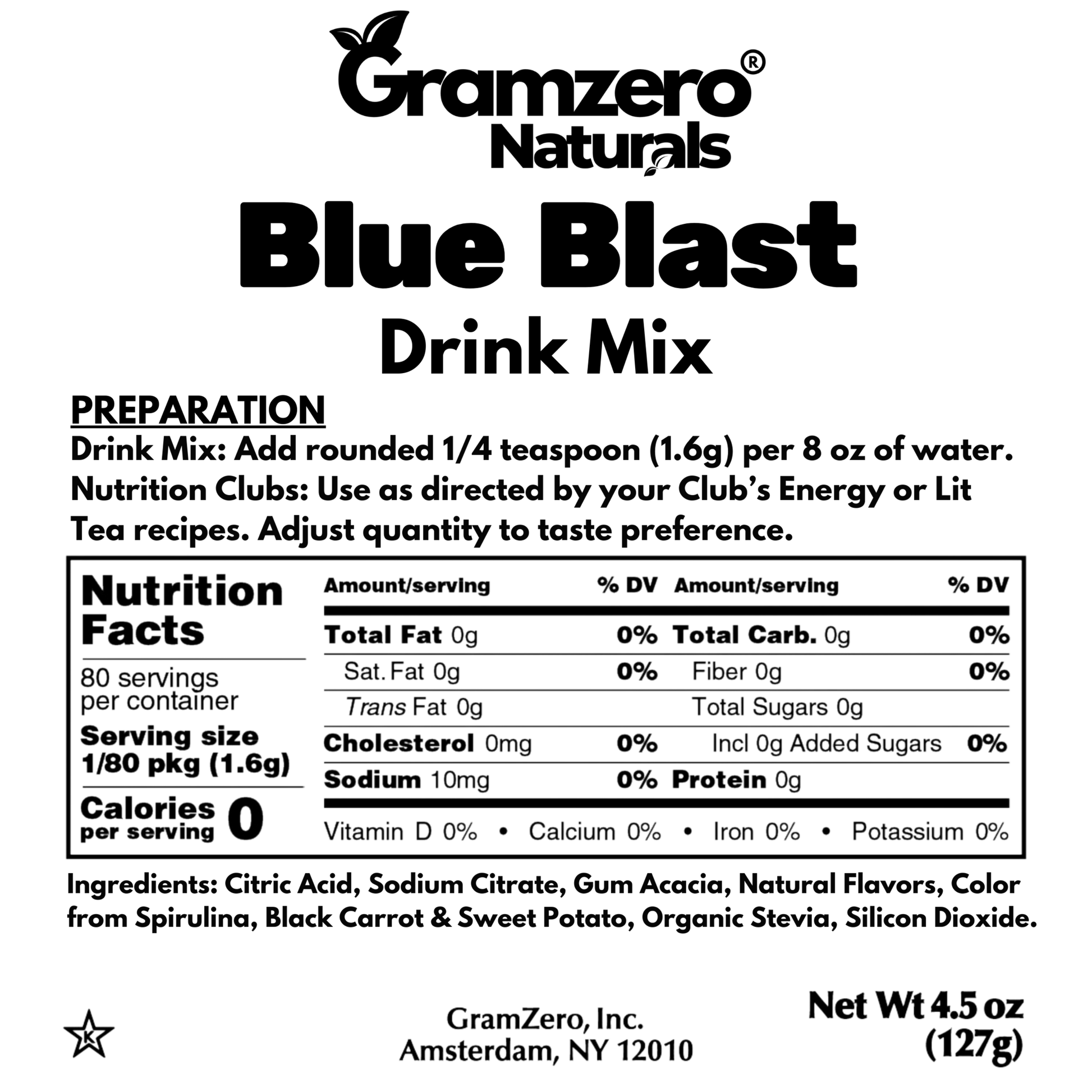 Blue Blast Naturals Drink Mix: Ingredients: Citric Acid, Sodium Citrate, Gum Acacia, Natural Flavors, Color from Spirulina, Black Carrot & Sweet Potato, Organic Stevia, Silicon Dioxide.