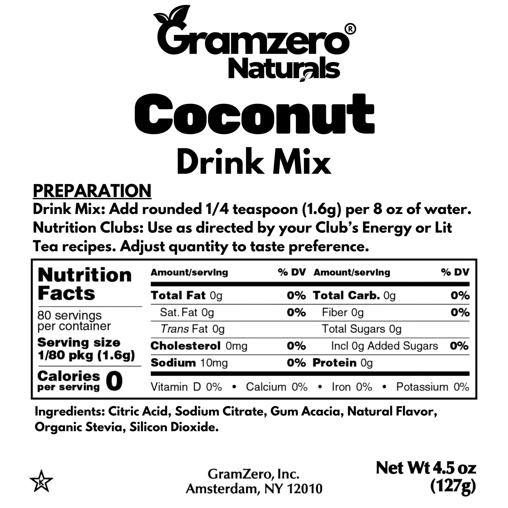 Coconut Naturals Drink Mix: Ingredients: Citric Acid, Sodium Citrate, Gum Acacia, Natural Flavor, Organic Stevia, Silicon Dioxide.