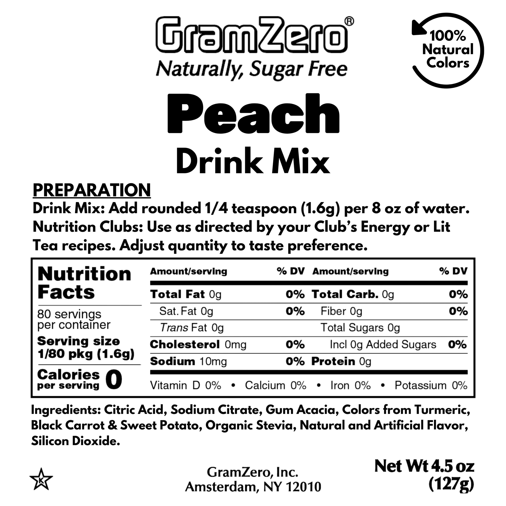This 4.5 ounce pouch of Sugar Free Powdered Drink Mix is a perfect size to sample GramZero's PEACH Flavor for Nutrition Club use as a 0 Calorie Energy Tea flavoring, as a Low Carb Drink Alternative and Keto Friendly Drink Mix, or to simply enjoy as a refreshing and hydrating Sugar Free Drink at home!