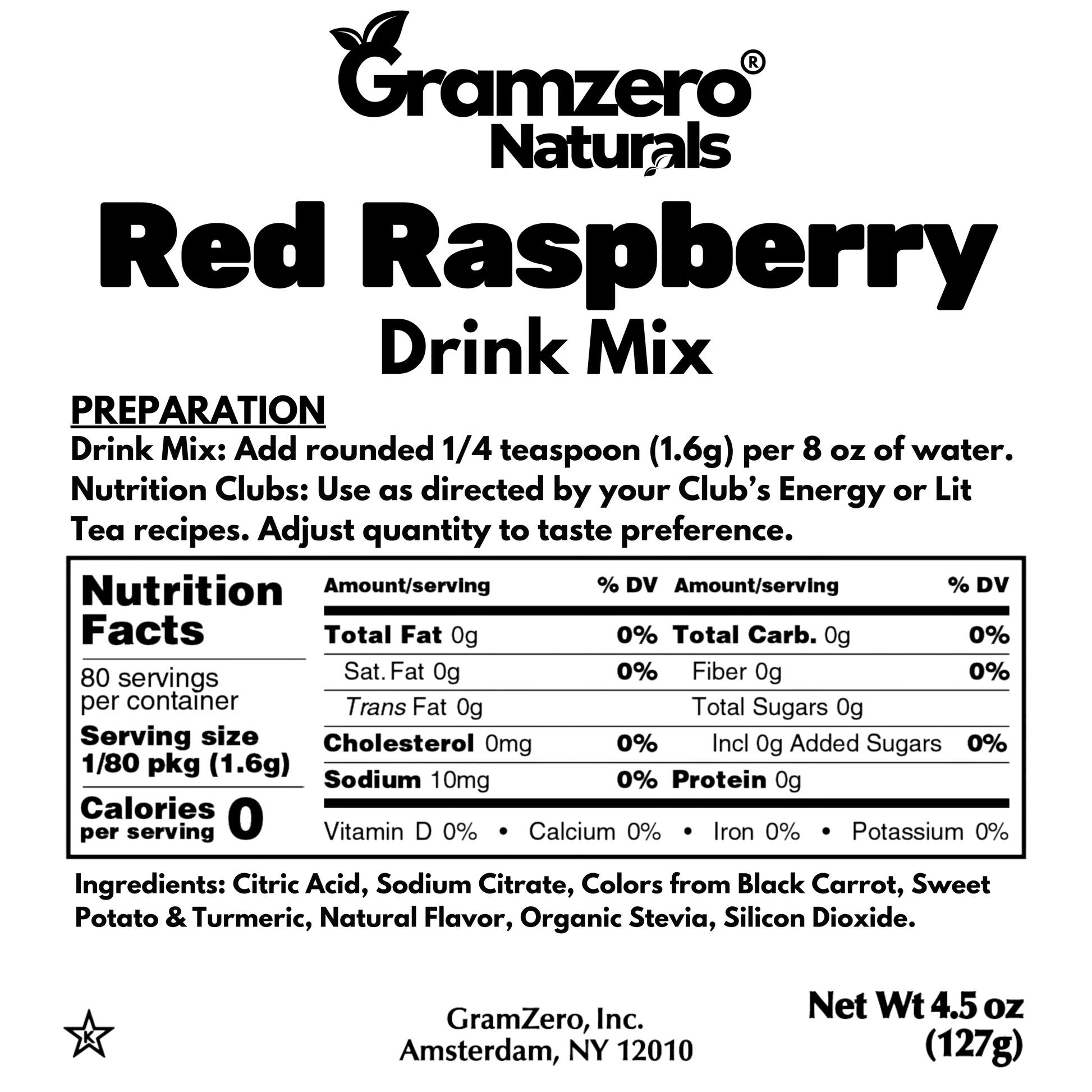 Red Raspberry Naturals Drink Mix: Ingredients: Citric Acid, Sodium Citrate, Colors from Black Carrot, Sweet Potato & Turmeric, Natural Flavor, Organic Stevia, Silicon Dioxide.